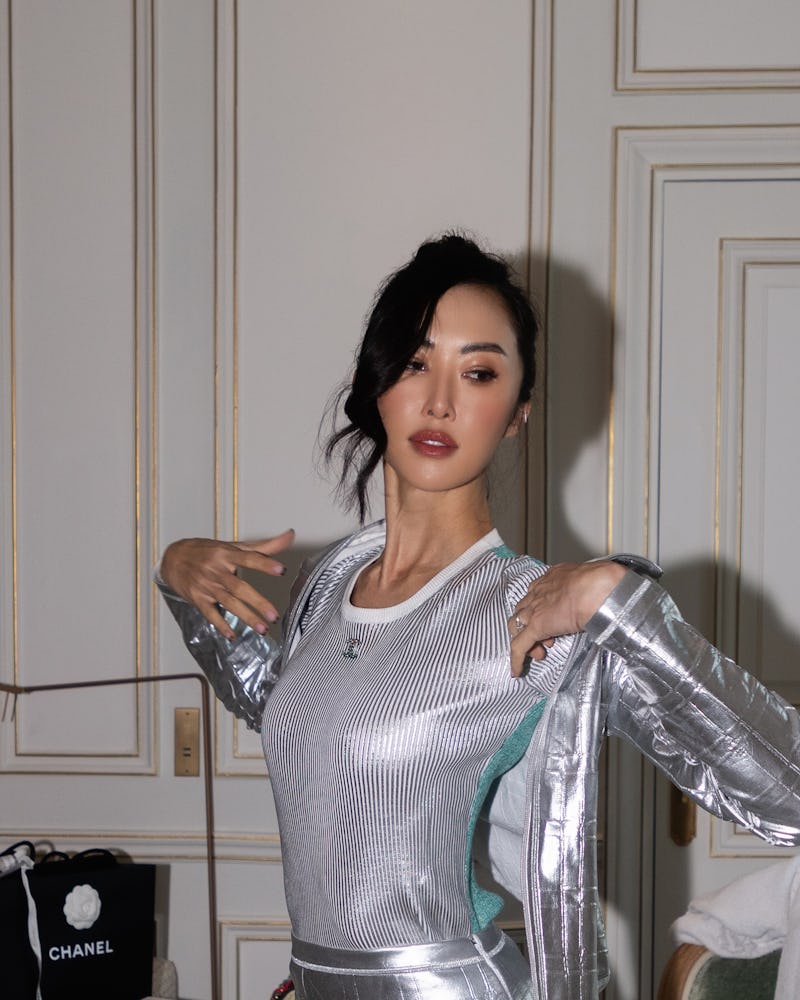 A perfect example of this is Lim’s look for the Chanel Fall/Winter 2025 show in Paris on March 11. Amid the pearl-covered tweed sets, the 39-year-old opted for a metallic skirt and hoodie set that read very L.A. cool girl. “It had kind of this futuristic element to it, but then I layered my own personal kind of leather coat on top of it,” says Lim. “One, it was cold, but two, I appreciate that Chanel always encourages us to give [looks] our own spin. So, just adding that element of my everyday kind of coat, made me really feel like myself.”