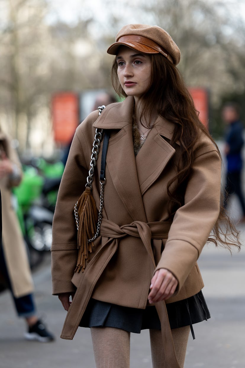 The hat may feel less intimating to wear if you sport it alongside pieces in a similar color palette. For instance, this fashion girl paired her brown style with a belted coat and fringe bag in near-identical shades.