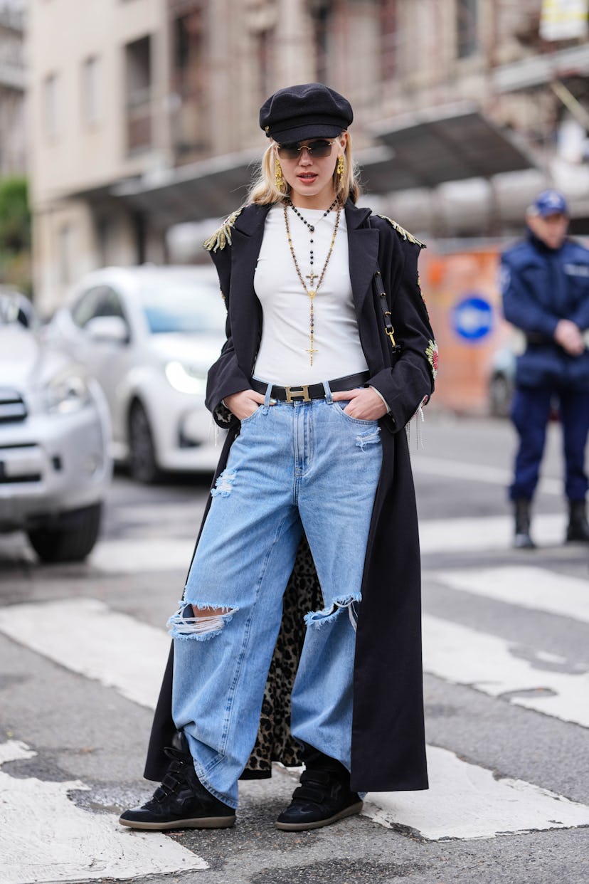 Flax loves a newsboy cap styled with a hint of novelty. “Lean into scarves, belts, and bag charms to really finish the look,” she recommends. Take notes from this street style star and incorporate leather gloves into the outfit on these final cold winter days.