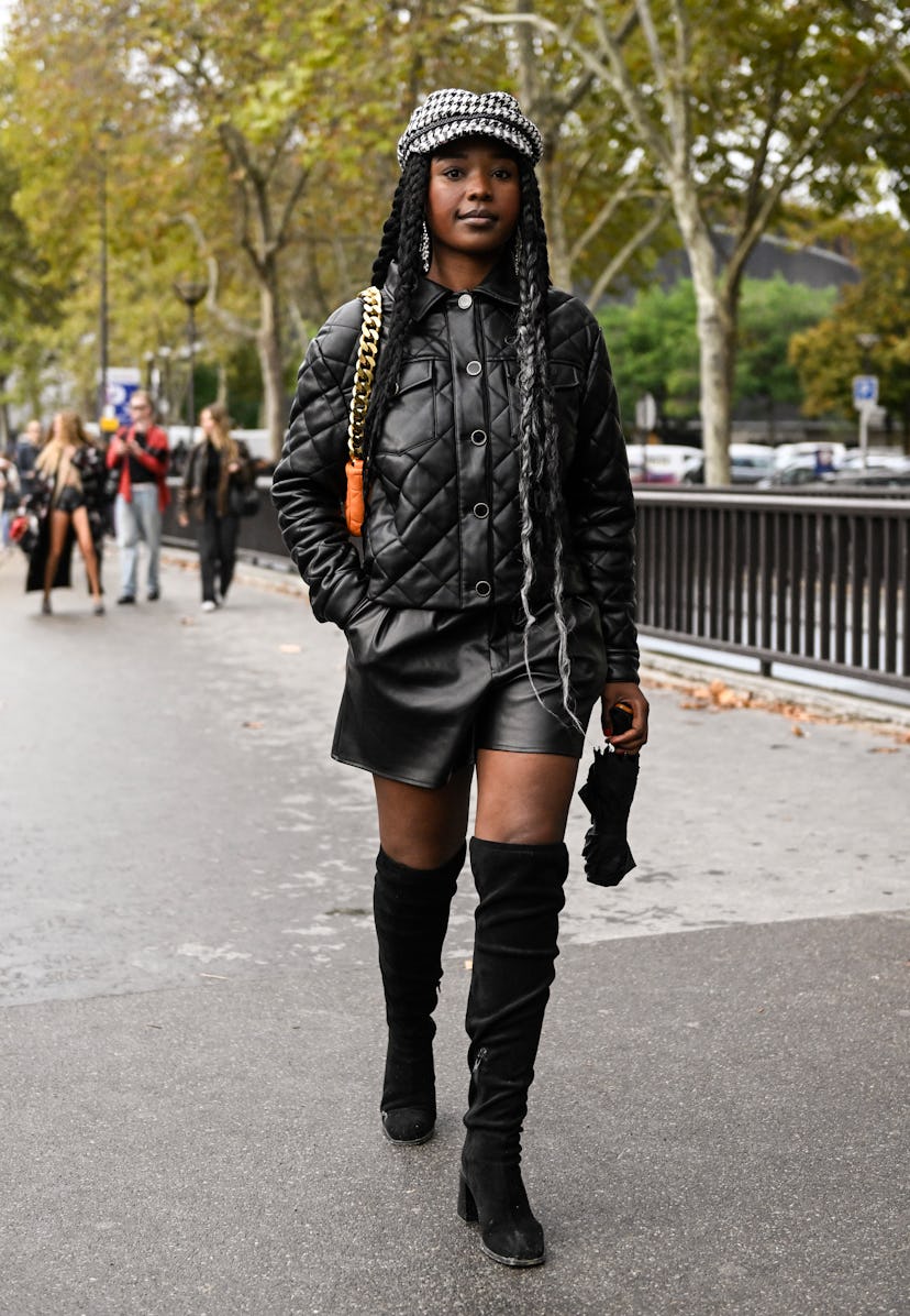 Should you be concerned about your look veering into Y2K territory, try a full leather outfit — like this quilted jacket and shorts combo above. Suede knee-high boots will only elevate the ensemble.
