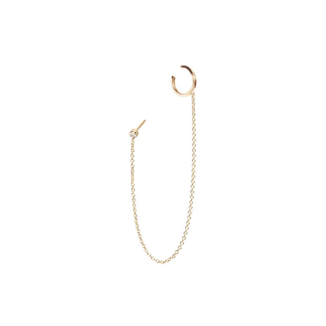 Above, a luxe example of a chain look. Made by Zoë Chicco, this option has a bezel set round diamond stud earring connected to a square bar ear cuff.