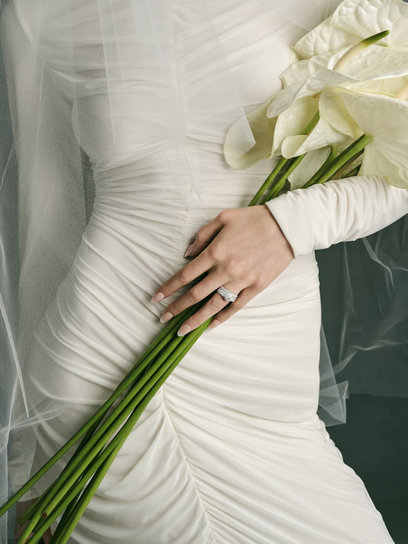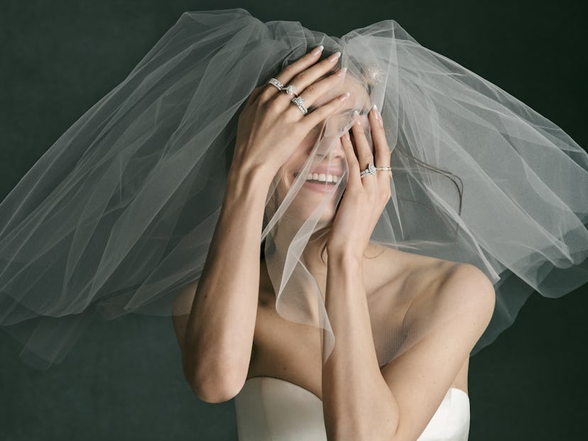 Yes, Wang has been a leader in the bridal business for nearly 35 years, but she’s still exploring different artistic avenues — as evidenced by her Jared collab. “With this bridal jewelry line, I was able to indulge in a more architectural, sleek, and modern [aesthetic than previous collaborations],” Wang says. But even so, her signature penchant for minimalism is still present — especially in the corresponding campaign. “The dresses we used [in the campaign] were very fashion-oriented, and for the most part, quite minimal,” she says. See: the ruched long-sleeve look, the strapless sweetheart-neckline number, and the tulle-heavy train. “The same goes for the jewelry, because minimal can be very [artistic] in terms of structure, proportion, and volume,” she adds.