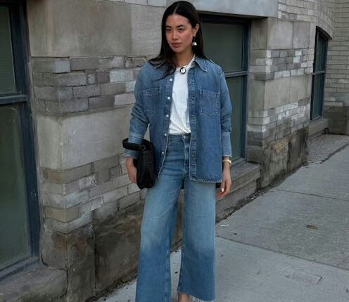 Why wear one piece of denim when you can sport three? Content creator Sasha Mei shows how it’s done, styling her flare jeans with a long button-up and pointy heels in the timeless fabric. Ground the denim-heavy getup with a simple white tee.