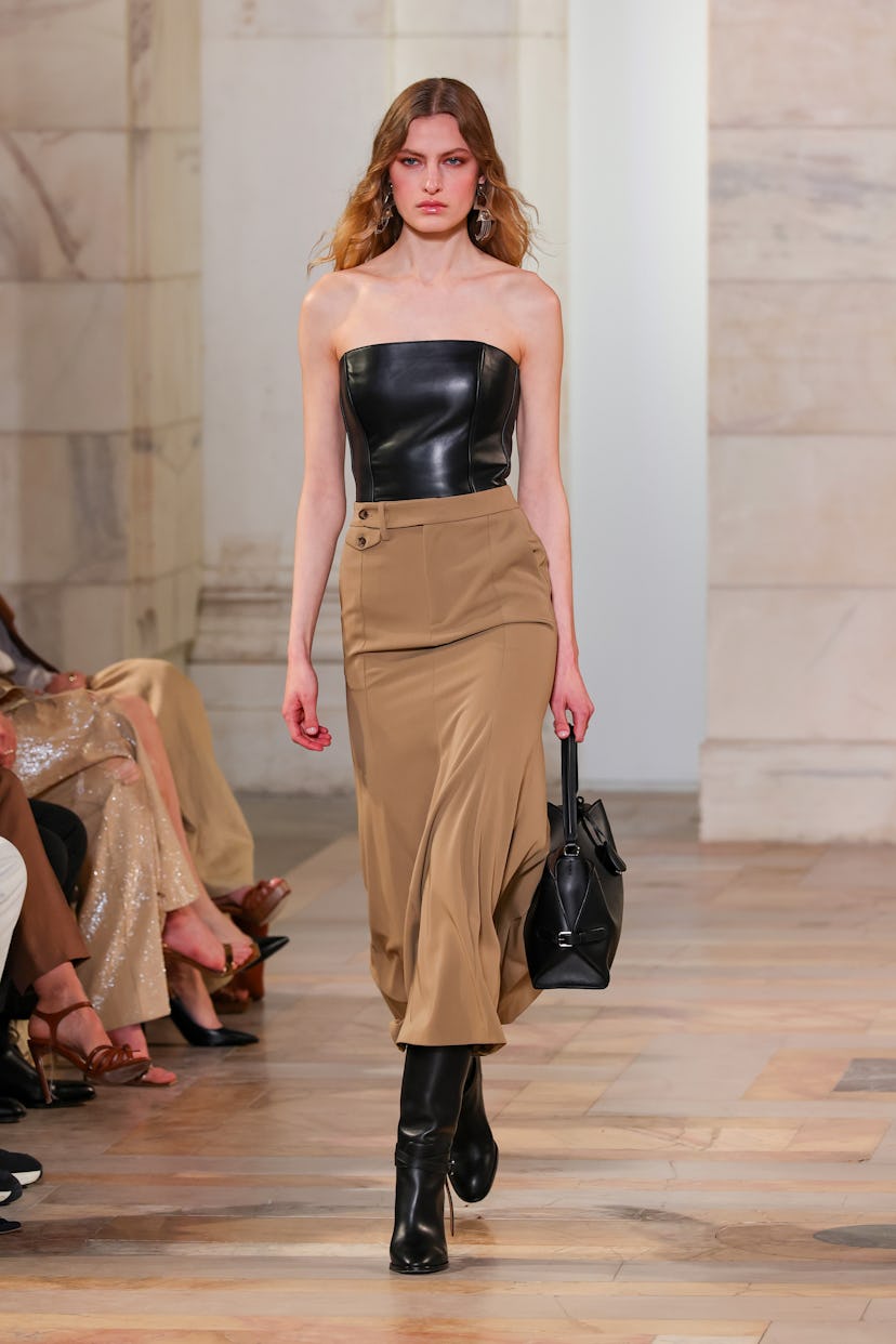 Tried-and-true fall-forward textures were reimagined for the season ahead. Outerwear included dual-finished wide-collared jackets that morph from leather to suede, achieved by a “manual process that will make each product produced one-of-a-kind.” An all-leather boiler suit was cinched just so by a wide statement belt, making it read at one elevated and formal. Even a skin-tight leather bustier top felt elegant and refined when paired with a camel midi skirt and boots. Corded velvet brought the cool ‘70s vibes with a modern edge. “The fabric appears in an unconstructed suit with a softly pleated floor-grazing skirt and a mini shirtdress that offers a surprise alternative to the prevailing longer lengths,” read the show notes.