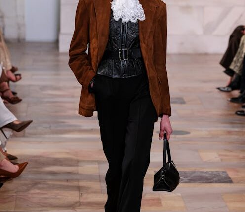 Designed for the “self-assured” woman who is “unbound by rules” and makes “luxury intensely personal,” the new installment paints a very glamorous, vintage-inspired picture. To start, high-neck frilly white blouses, reminiscent of the swashbuckling pirate aesthetic sweeping the runways of late, were key through lines in the collection. The romantic silhouette was paired with equally ostentatious jeweled brooches and scarves, structured blazers, and skinny trousers tucked into riding boots. According to the official press release, the look aligned with the “beautiful tensions” at play, “of masculine-and-feminine and rugged-and-refined—the dichotomies enriched by artisanal craft that elevates both chic classics and statement pieces to heirloom level.”