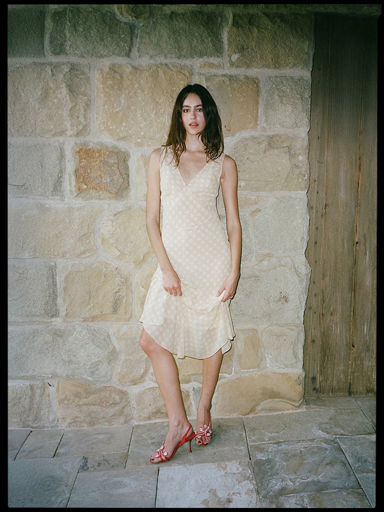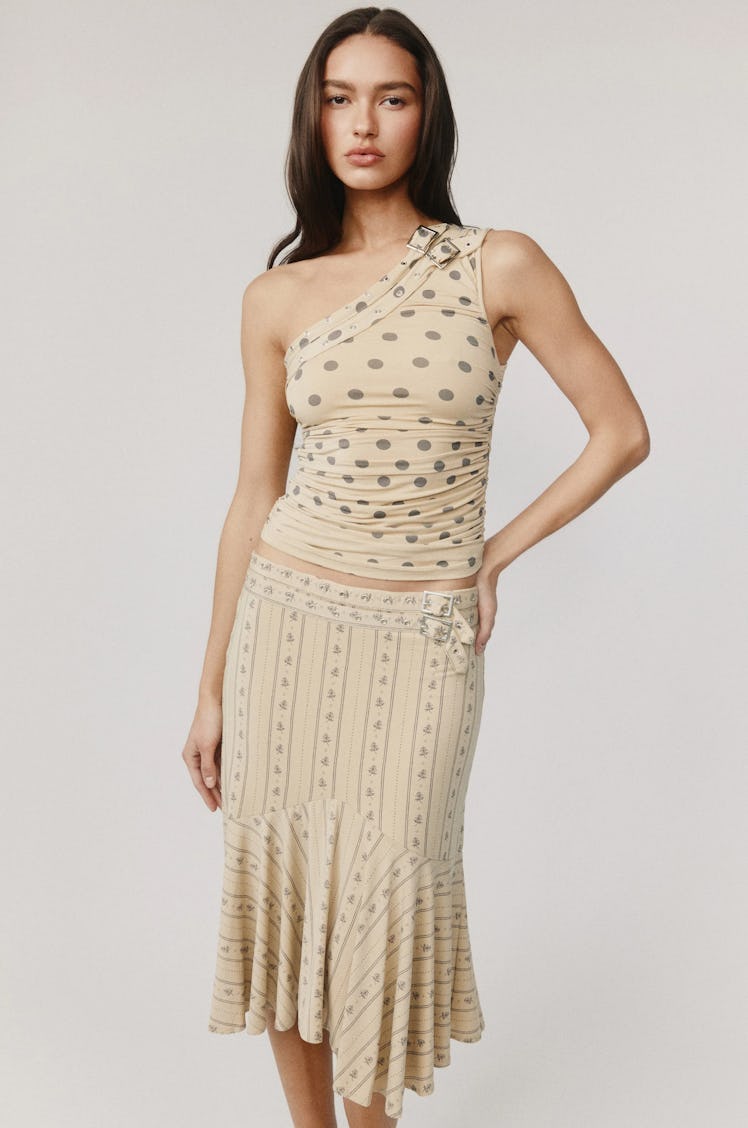 With Jéan is another fashion-girl favorite label capitalizing on the trend right now, splashing tank tops, midi skirts, bikinis, and more silhouettes with the pattern. When it comes to styling dotted looks, founders Sami Lorking-Tanner and Evangeline Titilas note how folks are quite experimental these days. “We’re seeing polka dots worn in more bold, directional ways — oversized dots on sheer layers, mixing dot scales in one outfit, or clashing them with unexpected prints,” they explain. “It’s fun to see how people are getting creative and making the print feel completely their own.”
