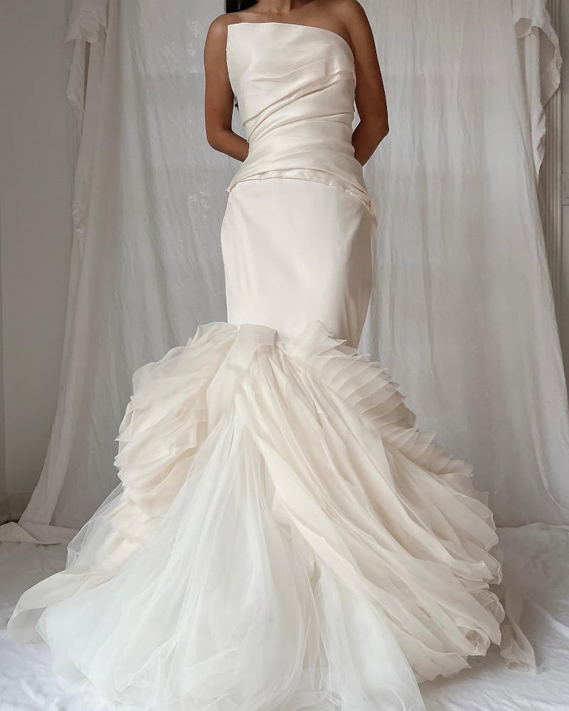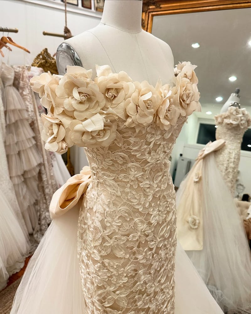 When Happy Isles opened in 2016, shopping for a vintage wedding gown meant “endless hours online only to order something and hope the style, size, and condition were accurate to what you saw online,” says Lily Kaizer, the owner of the L.A. and New York locations. “Not to mention missing out on the experience of visiting a bridal salon, working with expert stylists, and having that “Oh my god, she’s a bride!” moment with your nearest and dearest.” Kaizer wanted to do the “leg work” for her brides, so she curated ‘80s, ‘90s, and early 2000s designs from Valentino, Ralph Lauren, Christian Dior, Roberto Cavalli, and Thierry Mugler from “collectors looking to consign, European deadstock, or even our brides ready to pass their gown on to the next lucky lady,” Kaizer says.