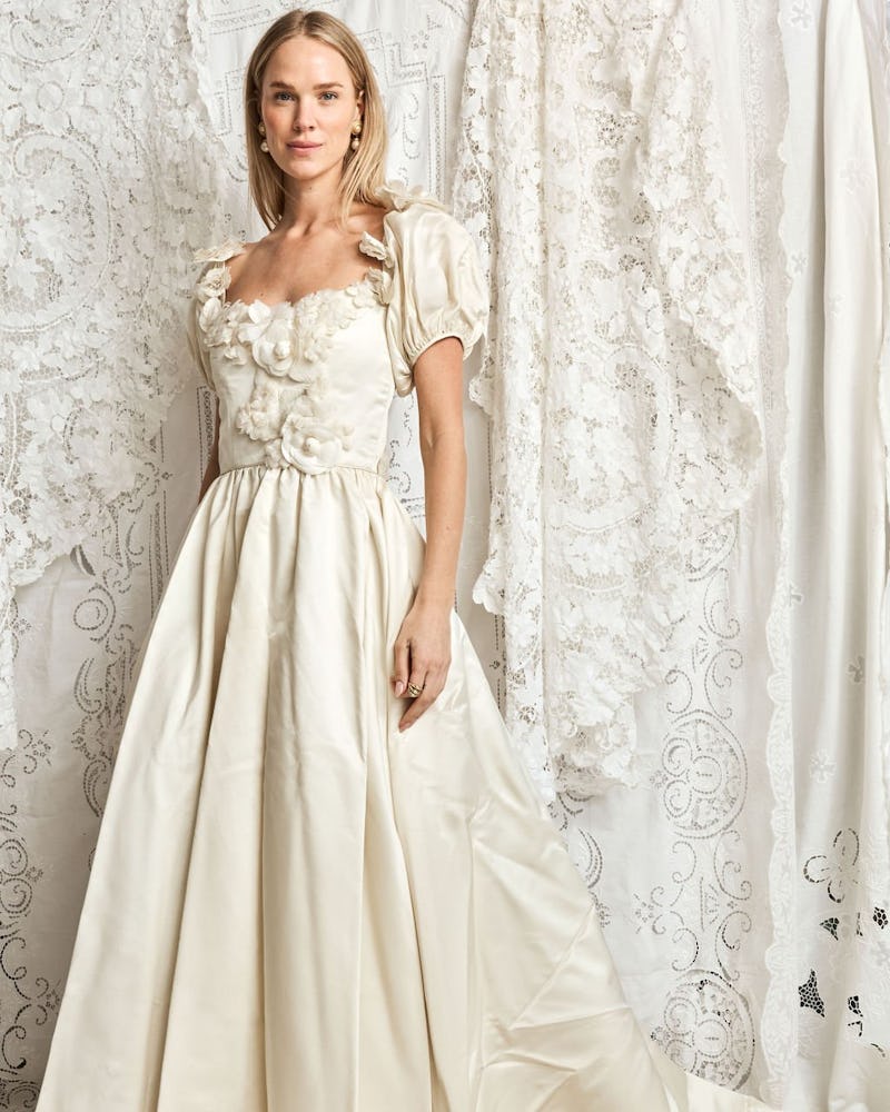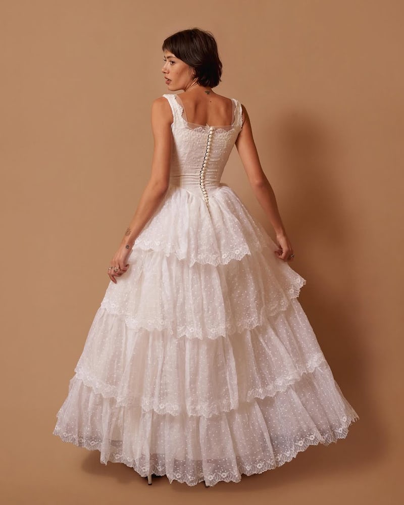 Also based in Los Angeles, Maddy Anderson, the founder of Madly Vintage says the city offers some of the best vintage in the world. “When I’m sourcing, I’m always thinking: Who would wear this, and how? Is she a Madly girl? And also, how can I rework or tailor this to make it even cuter or more modern?” Anderson tells TZR. To make retro bridal more accessible, she’s prepping to launch the “Madly Bridal Box,” a curated selection of vintage pieces that brides can try on at home, with the option to return what doesn’t work. “It’s totally new territory for me, since vintage sales are usually final, but I understand how particular brides can be when it comes to fit and wanting to see how things look with their accessories, shoes, etc.,” she says.
