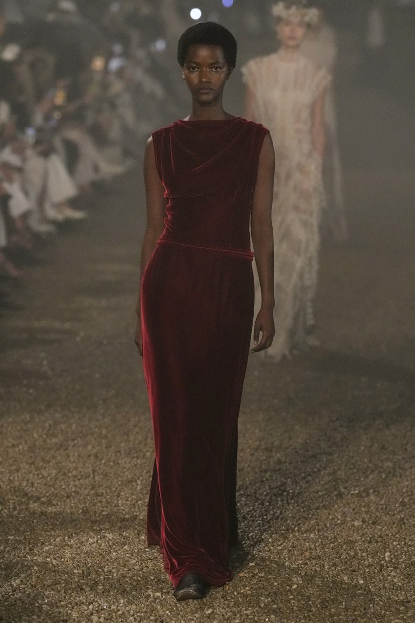 A slew of gauzy, Renaissance-esque long gowns swished back and forth down the runway — err, gravel walkway. The black and red velvet short dresses paid tribute to the Fontana sisters who dressed Anita Ekberg for the famous film La Dolce Vita, per the press release. Meanwhile, some of the airy numbers teetered into risqué territory, with sheer fabrics showing plenty of skin. And it wouldn’t be a Dior collection without timeless outerwear. This time around, she topped off feminine pieces with menswear-inspired military jackets.