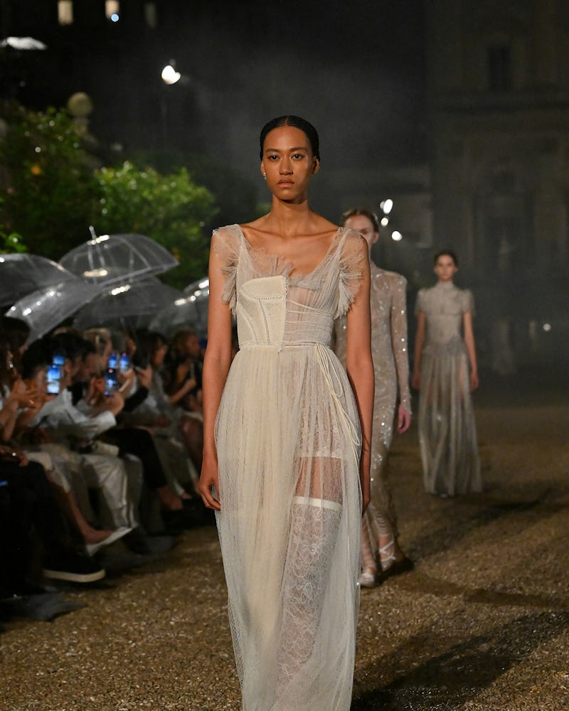 Despite the rainy weather, celebrities like Natalie Portman, Alexa Chung, and Rosamund Pike sat front row with clear umbrellas in hand, taking in the spectacular 80-look collection, which included a mix of haute couture and ready-to-wear confections. Models waltzed up and down the garden to music from the Sinfonietta Orchestra and Oliver Coates, with the drizzly and dark outdoor atmosphere looking quite enchanting and mystical.
