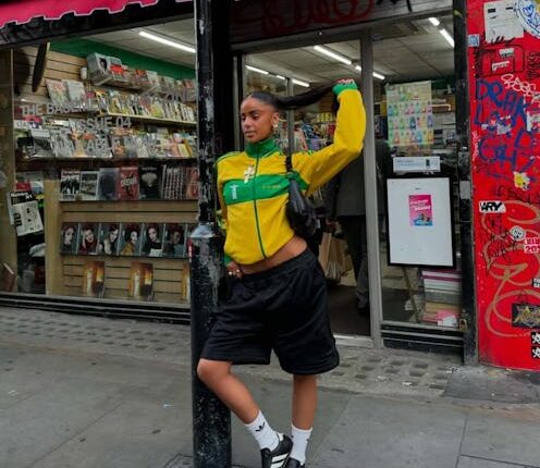 Keep the sporty vibe going throughout the rest of your look by teaming your kicks with a colorful track jacket and knee-skimming athletic shorts. From there, jazz things up with a leather shoulder bag and shiny gold statement earrings.
