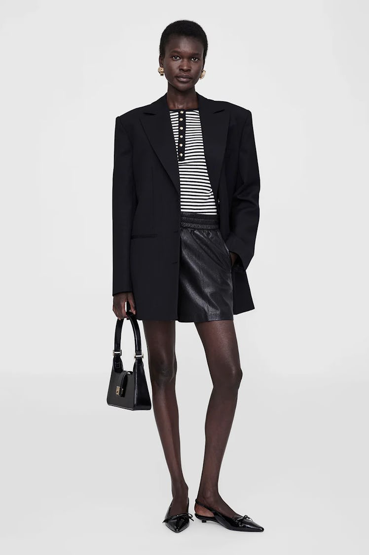 Dressing for those unexpectedly chilly summer afternoons is no easy feat. One idea? Layer an oversized short-sleeve tee over a long-sleeve top, a styling hack that reigned in the early 2000s. Then, pull out your leather shorts before it gets too hot to even think about the material. The label’s black sneakers are the perfect finishing touch here.