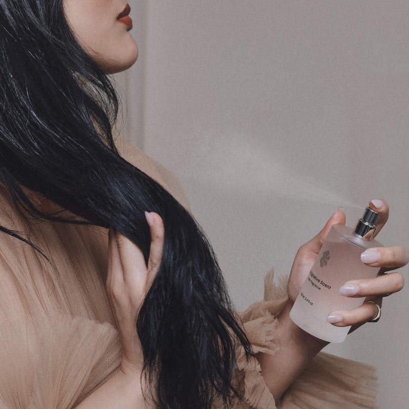 Another application method that works well is what Corrales calls a full-coverage cloud. “Spray 10 to 15 spritzes of the hair perfume starting from above your head to your shoulders, clothes, and skin, and even the back of your neck. It’s a subtle way to catch whiffs of fragrance every time the hair moves, and it’s great for longer hair.”
