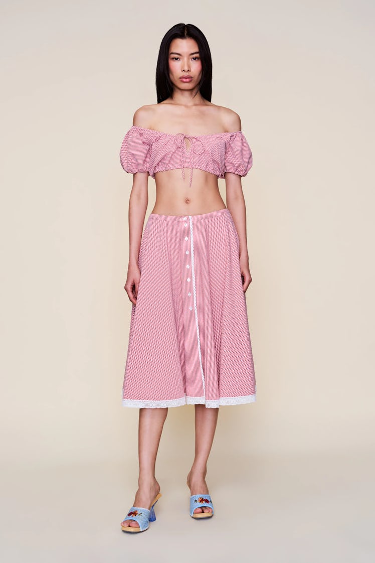 Heed Cafiero’s advice and pack a matching set for the excursion — linen and cotton are excellent in the heat. Consider a two-piece look in gingham, which happens to be a major print trend this summer. Or, if you’re hoping to pair the top or bottom with other separates, a cream set is the way to go. Wear sneakers for an afternoon exploring the area, and sandals or heels for dinner.
