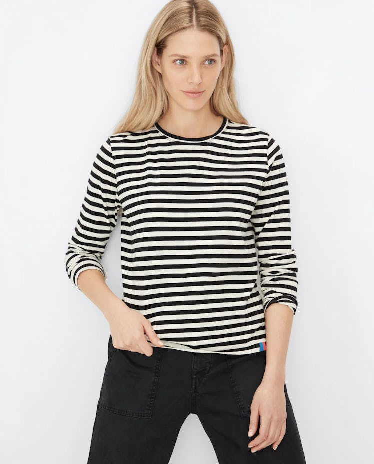 Kramer has been drawn to overalls as of late. “They’re such a fun throwback and make the perfect transitional piece as we head into fall,” she explains. On those kinda-warm, kinda-chilly days towards the tail end of summer, layer yours atop a striped long-sleeve tee or a thin cashmere pullover.