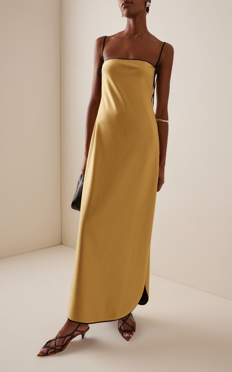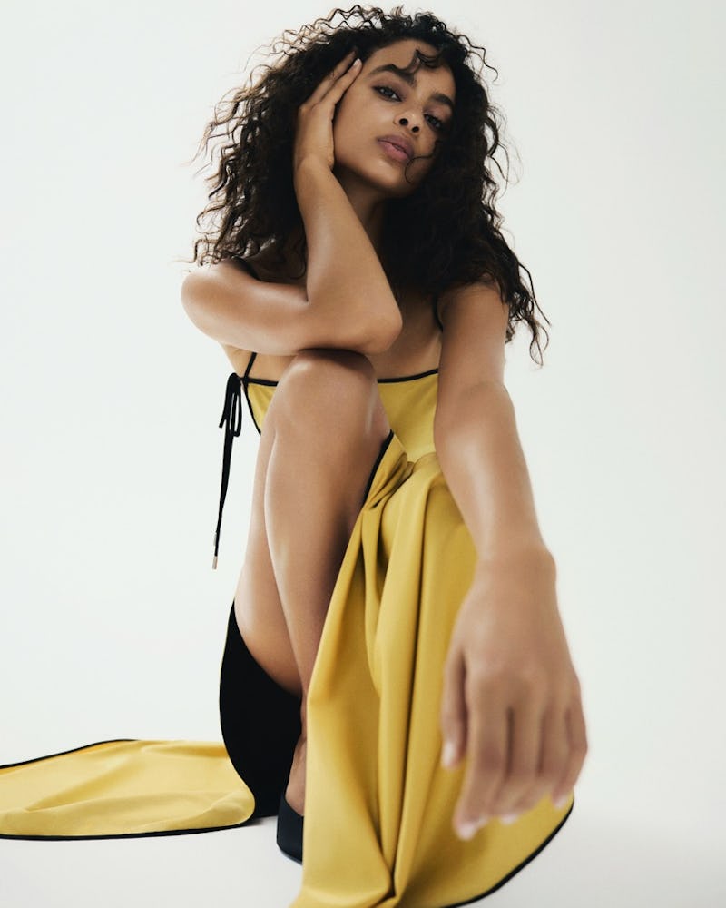 “I’m still pinching myself at how quickly it all moved,” says the designer. “I mean, we sold out of Summer Bones overnight, with one colorway, Goldenrod, selling out in just three hours.” The hot ticket style was the foundational concept for TEMILY’s The Body Electric collection, consisting of the brand’s signature satin maxi dress with black piping — which also comes in a mini dress and a two-piece mini skirt version.