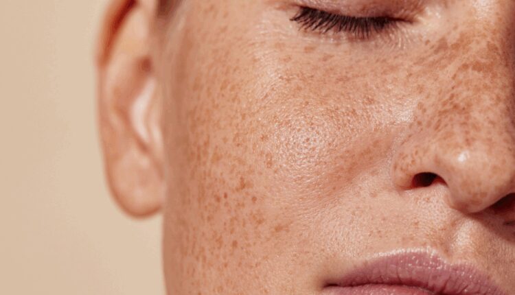 Close-up of a person shielding their face from the sun with their hand, showing sun-kissed skin with visible freckles and texture.