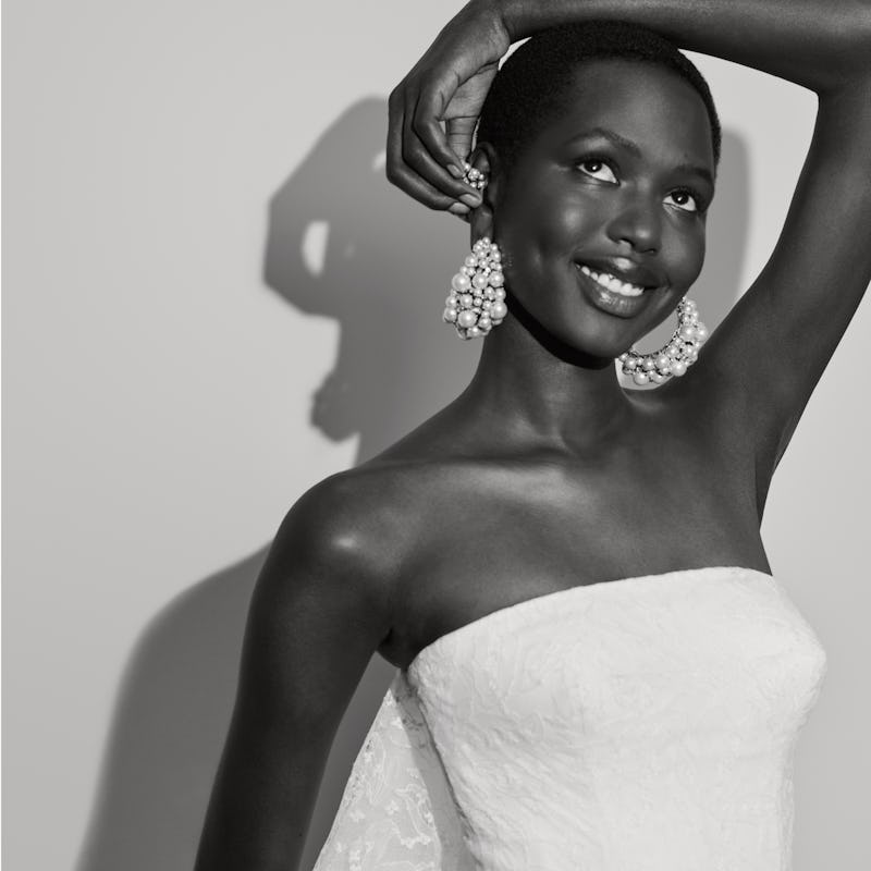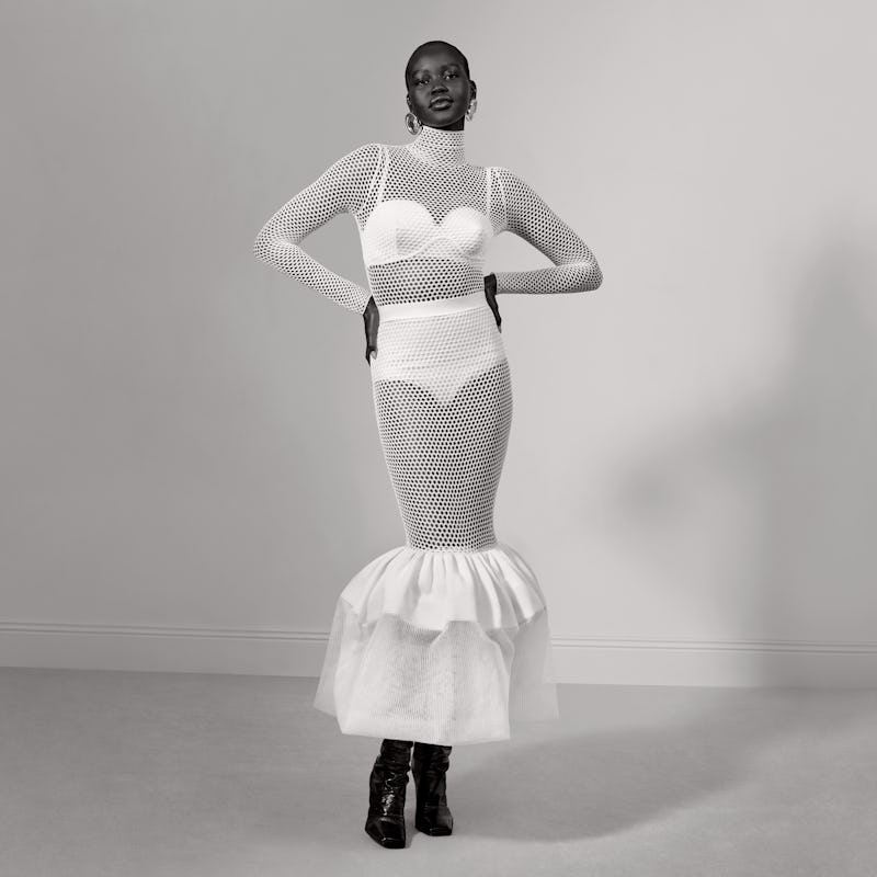 Beyond Gerber’s jeweled top and Ceretti’s adorned dress, a standout fashion moment of the Fall/Winter 2025 campaign is the look worn by South Sudanese model Nyaduola Gabriel. The high-neck knitted mesh net dress with a fishtail hem has inspired significant red carpet appearances this summer on stylish stars including Charlize Thereon and Vanessa Kirby.