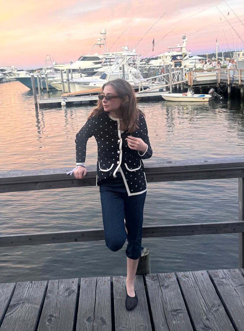 "I could wax poetic about RIXO’s chic collection of dresses; I always turn to the label’s breezy, print-perfect frocks for special occasions, from weddings to work events. And much to my delight, I recently discovered that its knitwear is just as amazing. This polka dot cardigan is the second RIXO sweater I’ve tried — I actually own the same silhouette in a colorful pink, red, and tan striped style, which I brought on a trip to Monaco earlier this summer. Its dotted cardi was a go-to during Labor Day weekend in Montauk, where the weather got quite chilly in the evening. Crafted from a wool-blend, the knit kept me nice and cozy (and more importantly, didn’t irritate my skin). I made the cardigan the pièce de résistance of my casual night-out look, opting for denim capris and mesh ballet flats. I have a sneaking suspicion I’ll reach for this polka dot look on repeat this fall and winter."