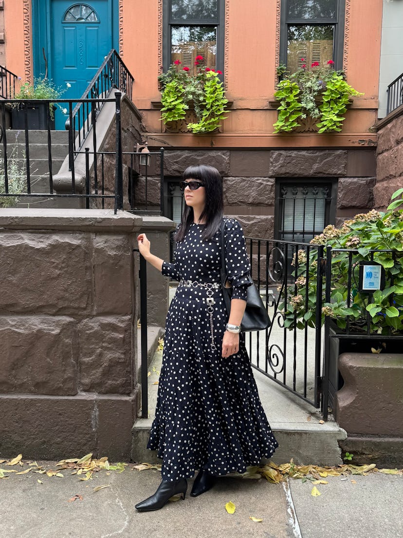 "Rixo has been one of my go-to brands for dresses for years because the styles are elegant yet whimsical, and somehow work across an array of occasions. (It’s rare for a frock to be suitable for both a casual brunch date and a wedding shower.) To put it plainly, you never have to justify cost per wear before adding one of the British label’s pieces to your cart. Case in point: the Kristen Midi Dress. Initially, the navy and white polka dot print caught my eye as a means to take the print of the summer into fall, but the lightweight fabric, long sleeves, and tiered skirt makes it ideal for the season’s temperamental weather. On a jam-packed work day, it’ll take me from crisp morning commute to balmy mid-afternoon coffee meetings to chilly evening dinner plans. With fall in mind, I paired it with knee-high boots, the bucket bag I carry on office days, and a silver belt and cuff for added vintage flair."