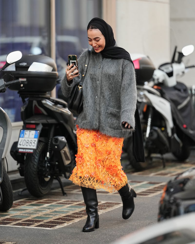 It seems this fresh, citrusy shade has already won over the style set, too, as it’s popping up everywhere on the streets this month. In Milan, specifically, longtime fashion insider Caroline Issa expressed her love for the color, wearing it in the form of a structured blazer atop a white graphic tee. Another guest, meanwhile, hit the shows in a bright orange lace skirt with floral embellishments. She countered the boldness of the bottoms with a fuzzy gray cardigan — an outfit formula you can wear well before spring.