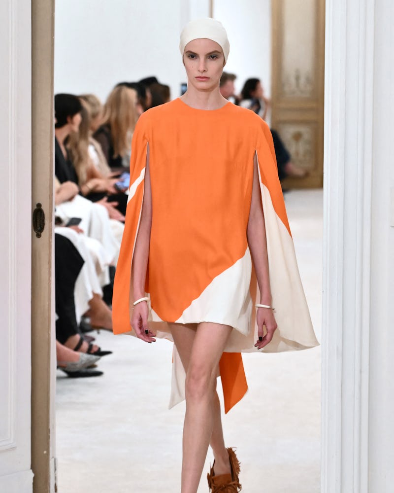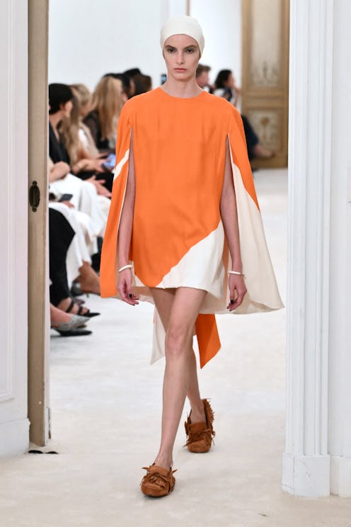 Meanwhile, over at Moschino, CD Adrian Appiolaza went with a more muted pumpkin spice shade of orange, presented by way of a knitted mini dress that also boasted mustard yellow and rich red. And if you’ve ever dreamed of looking like a walking creamsicle, it seems it’s your lucky day, as Alberta Ferretti debuted a flowy orange and white mini dress with a built-in cape. (Summer treat, but make it chic.)