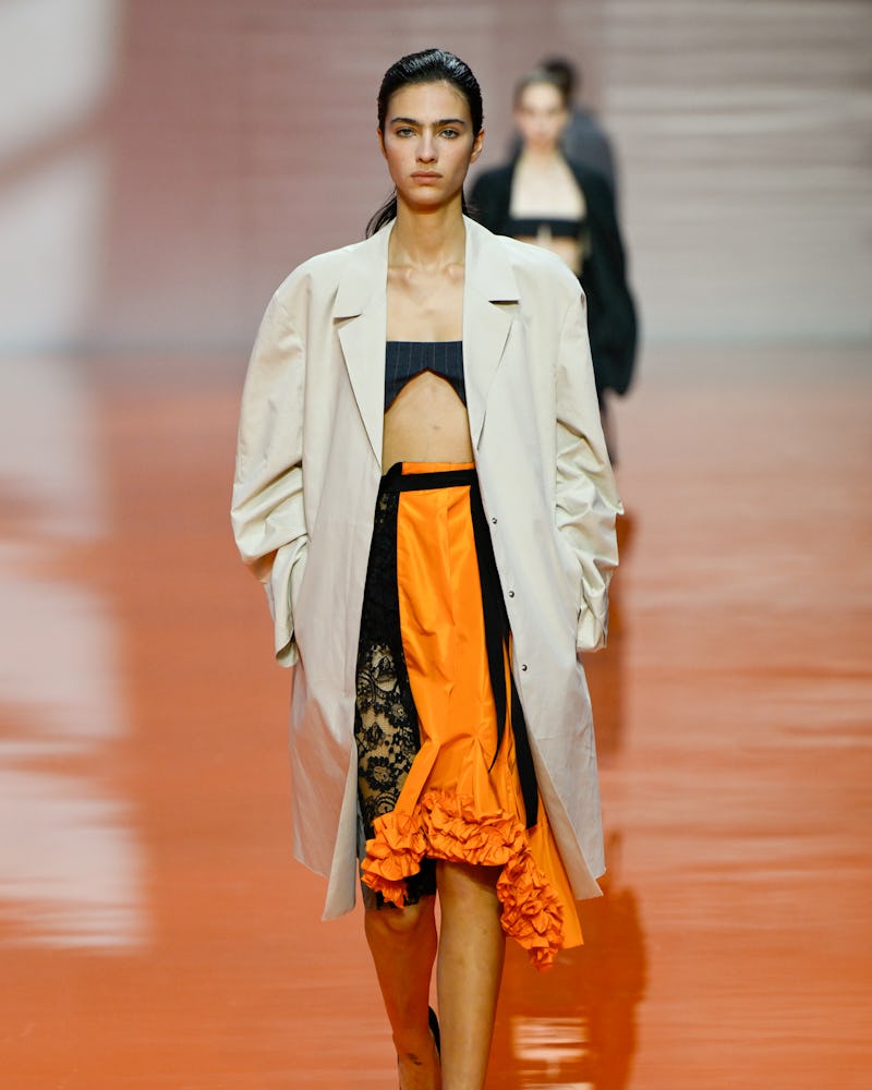 But how does one incorporate citrus orange into their wardrobe? Alessandro Dell’Acqua, the creative director of No. 21, has some sound ideas. In the luxury label’s newest collection, the Italian designer leaned heavily into the shade, splashing it on a blazer and skirt set, fitted cardigan, and shoulder bag. Yes, the bold color is arguably suitable for the office, everyday outings, and nights out. Miuccia Prada and Raf Simons, the co-creative directors of Prada, would agree. On the label’s catwalk, a glamorous ruffled midi skirt rendered in neon orange (perfect for a swanky dinner or date) was styled with a bra top and a long blazer. For something more casual, look to the brand’s tangerine-colored undies, which were layered underneath a gauzy black see-through skirt. Even showing just a sliver of the bright briefs will punch up your whole outfit.