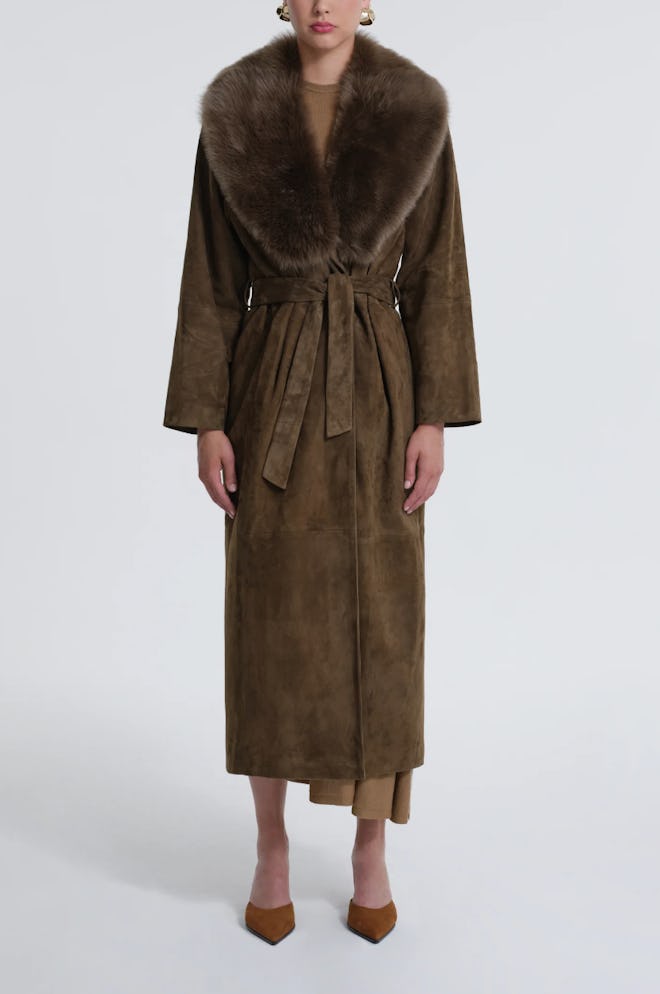 From the fashion editor-favorite brand, this longline belted number in a sumptuous olive shade comes with a detachable shearling collar which will extend the typical window of suede coat season.