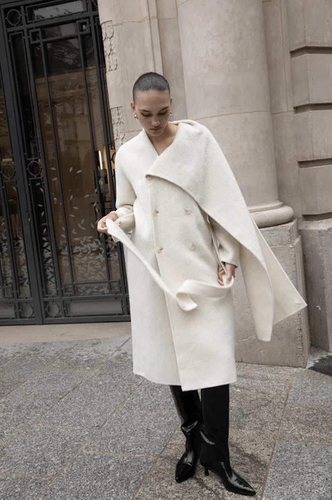 The coat-scarf hybrid continues to have everyone in a chokehold…if you’ll excuse the pun. Emerging brand Centre Piece offers this timeless ivory silhouette rendered in 100% wool-silk with a built-in layer that’s large enough to double as a chic hood.