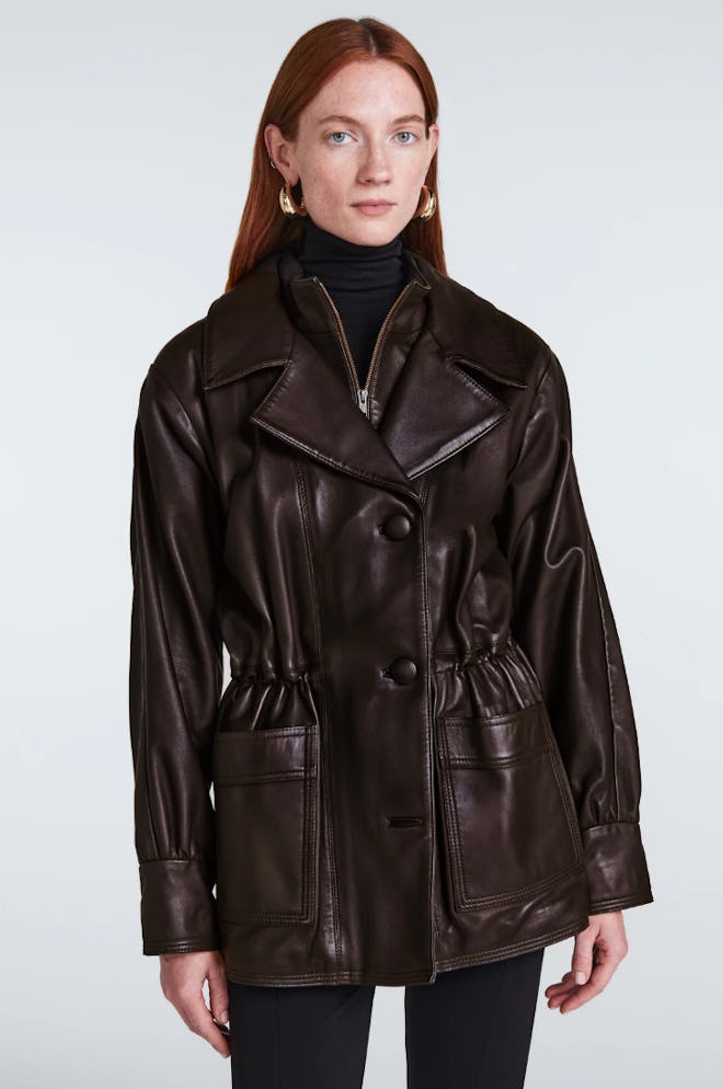 Ducie, the London-based brand beloved by everyone from Hailey Bieber to Jennifer Lopez, continues its streak in the coat category with the addition of this double- collar drawcord waist baby in bitter chocolate leather.
