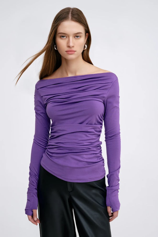 You can never have too many going-out tops in your collection, and this purple long-sleeve draped look is perfect for chilly weather.