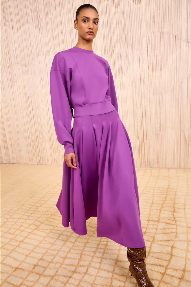 Stand out in a sea of neutral suits in the office with Ulla Johnson’s bright violet high-waist midi skirt. Opting for the matching pullover will earn you extra style points.