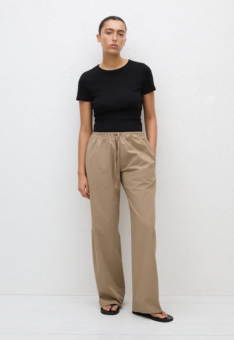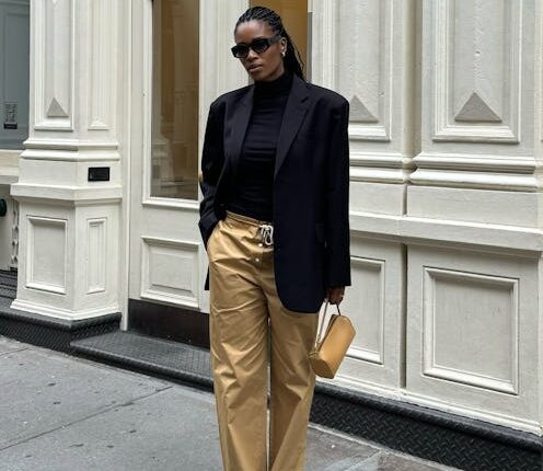 For a feel-good pair of khaki pants, opt for a drawstring silhouette. Above, content Marilyn Nwawulor-Kazemaks spruced up the laid-back bottoms with a black tailored blazer and turtleneck tee. Complete the look with ballet flats or loafers — whichever is more your vibe.