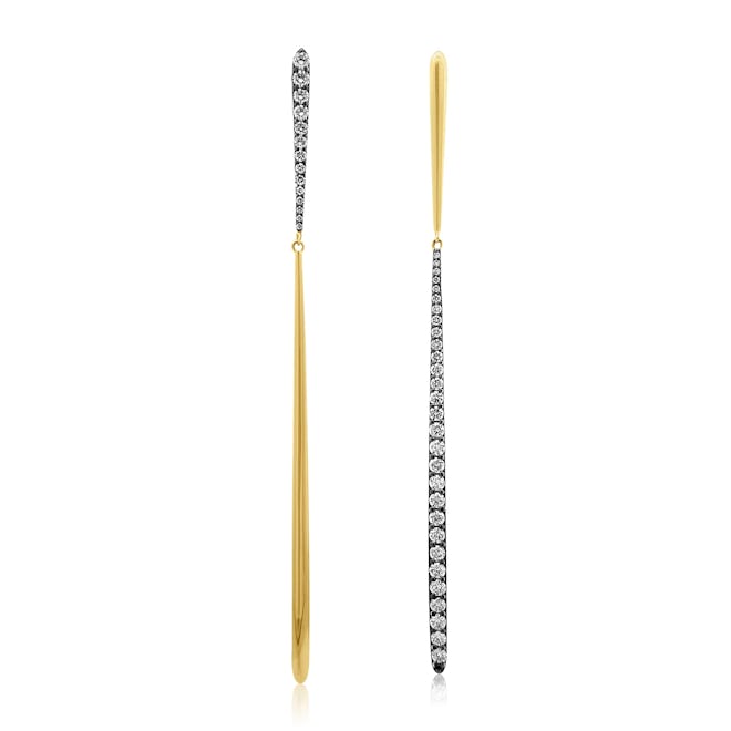 The jewelry trend took shape on the Spring/Summer 2025 runways, endorsed by heavy-hitters including Chloé, Isabel Marant, and Fendi. More recently, Zimmermann tapped into the trend for fall 2025, debuting gold dangly silhouettes in different shapes. Of course, it didn’t take long for fine and contemporary jewelry brands to follow suit. One such label is Elyzian, which offers luxe mismatched diamond and gold drop earrings.
