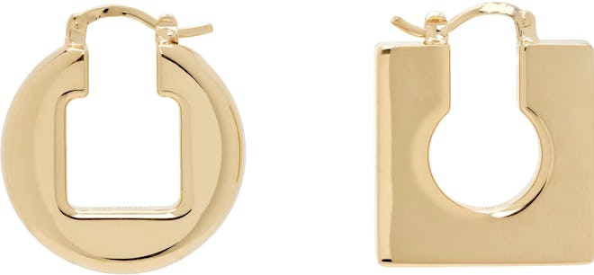 For a luxe take on the whimsical jewelry trend, look to Jacquemus’ ‘The Rond Carée’ earrings, which include square and round-shaped hoops rendered in gold-tone brass.