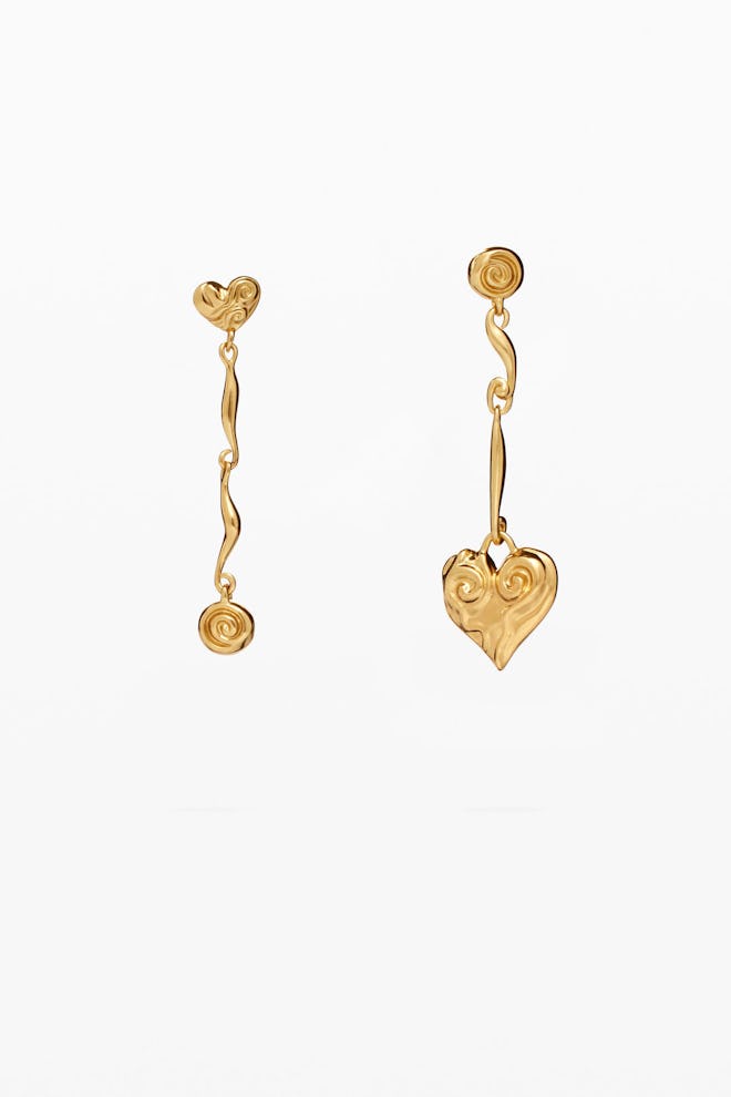 With hearts and serpentine shapes, Desigual’s asymmetric earrings ooze romance. Make them the star of your jewelry look by opting for dainty necklaces.