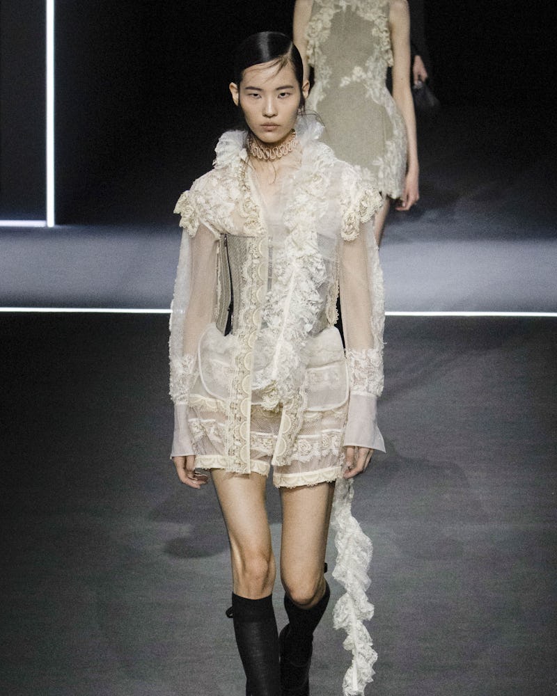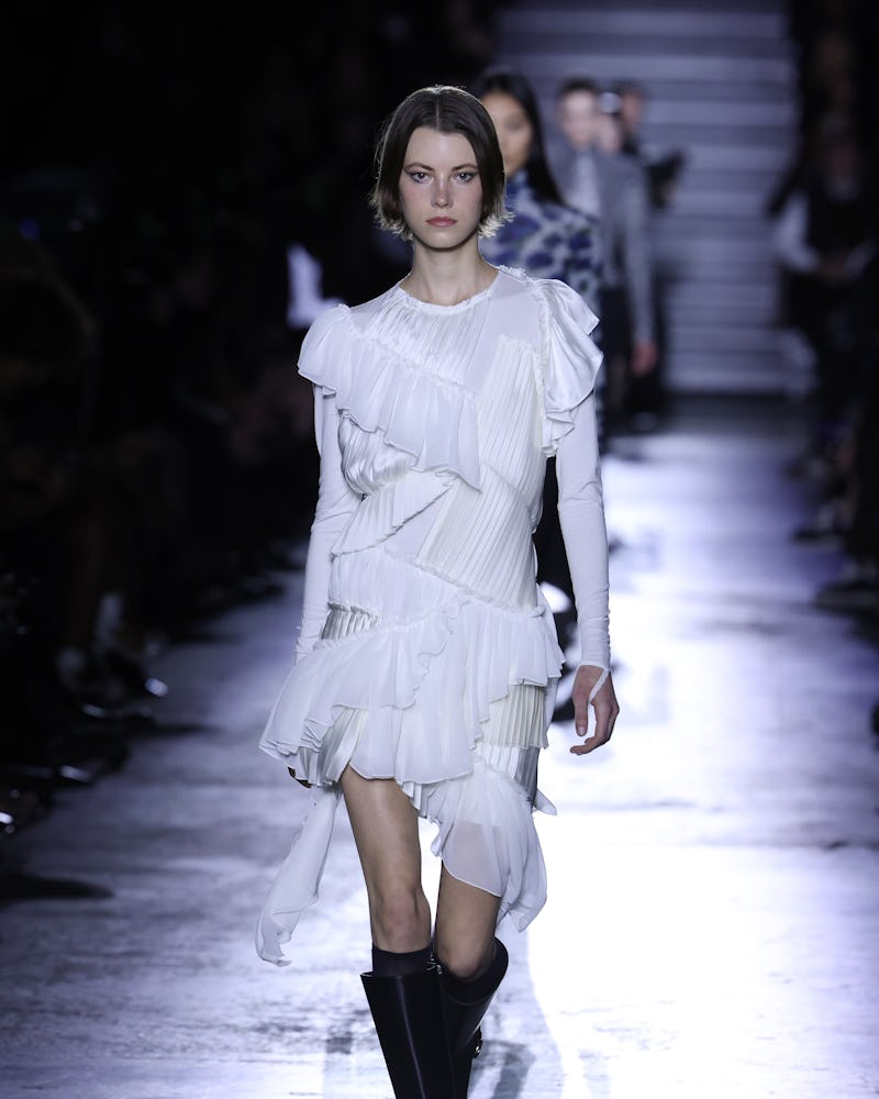 Kicking off fashion month in New York, Anna Sui tapped into both details, showing a sweet lace blouse with ruffles around the sleeves, which was decidedly reminiscent of Victorian-era fashion (aka the 19th century). Chloé approached the aesthetic with a bohemian slant, sending out a long-sleeve lace crop top in a vintage floral pattern, paired with a matching low-slung maxi skirt finished with a delicate waist ruffle. Dior took the idea in a lingerie-inspired direction, featuring a structured corset layered with airy ruffled panels. Coperni played with volume, presenting a pleated mini dress edged in chiffon ruffles.
