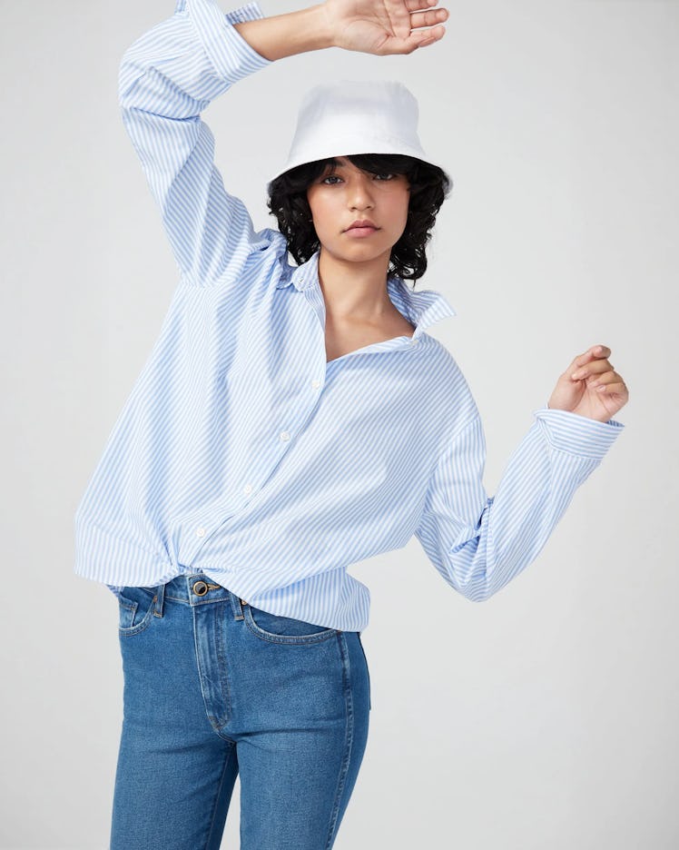 A preppy striped button-down may not be your first thought when it comes to styling a black lace skirt. But writer and stylist Elizabeth Cardinal Tamkin proves the contrast works beautifully. Kick your look into high gear by belting the blouse and finishing with black-and-white ballet flats.