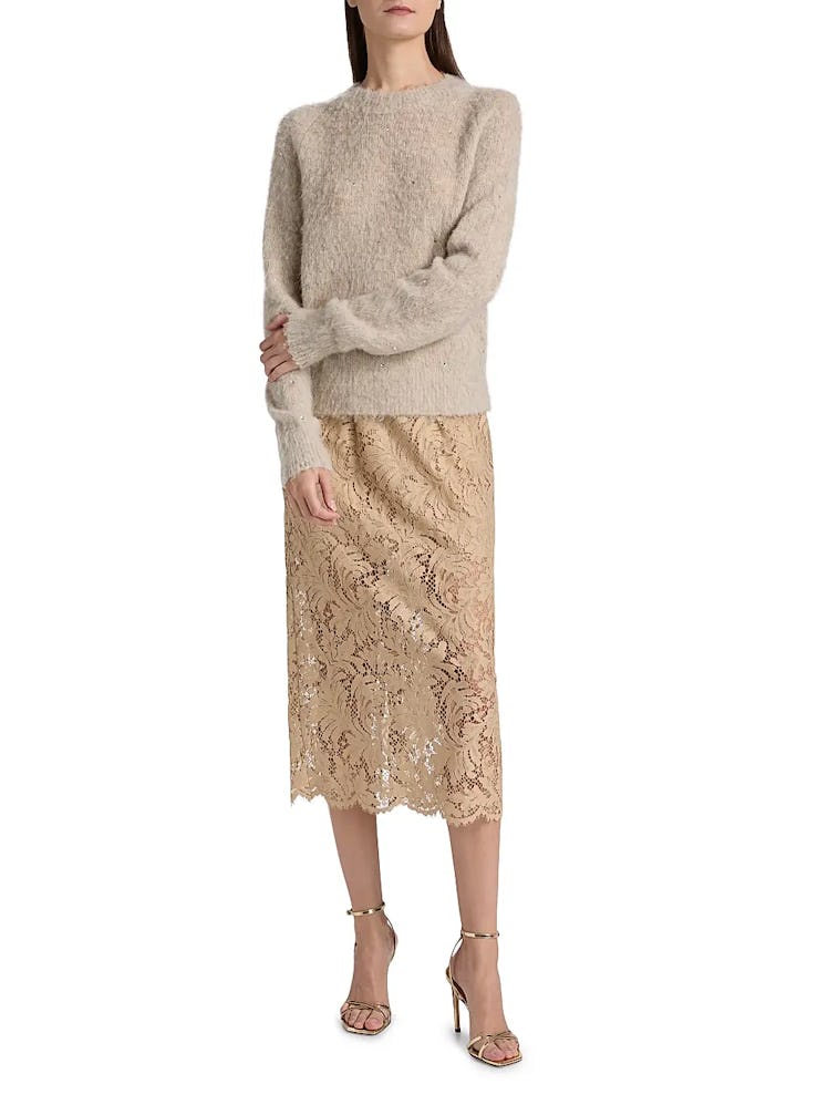 A lace pencil skirt works in a variety of occasions, from a business meeting to a fancy dinner. Follow Olivia Perez’s lead and pair it with a silk blouse for a head-to-toe ladylike ensemble. Mules in the same champagne color palette aren’t a bad idea, either.