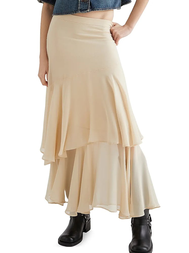 As always, the Wrong-Shoe Theory prevails. This is a prime example of how to pull off the styling hack. It’s simple: offset a ruffled tiered maxi skirt with sporty sneakers. And if those kicks happen to be early-aughts Nike Shox, even better. To keep the outfit from tipping into costume territory, anchor it with a ruched black blouse and sleek, shiny jewelry.