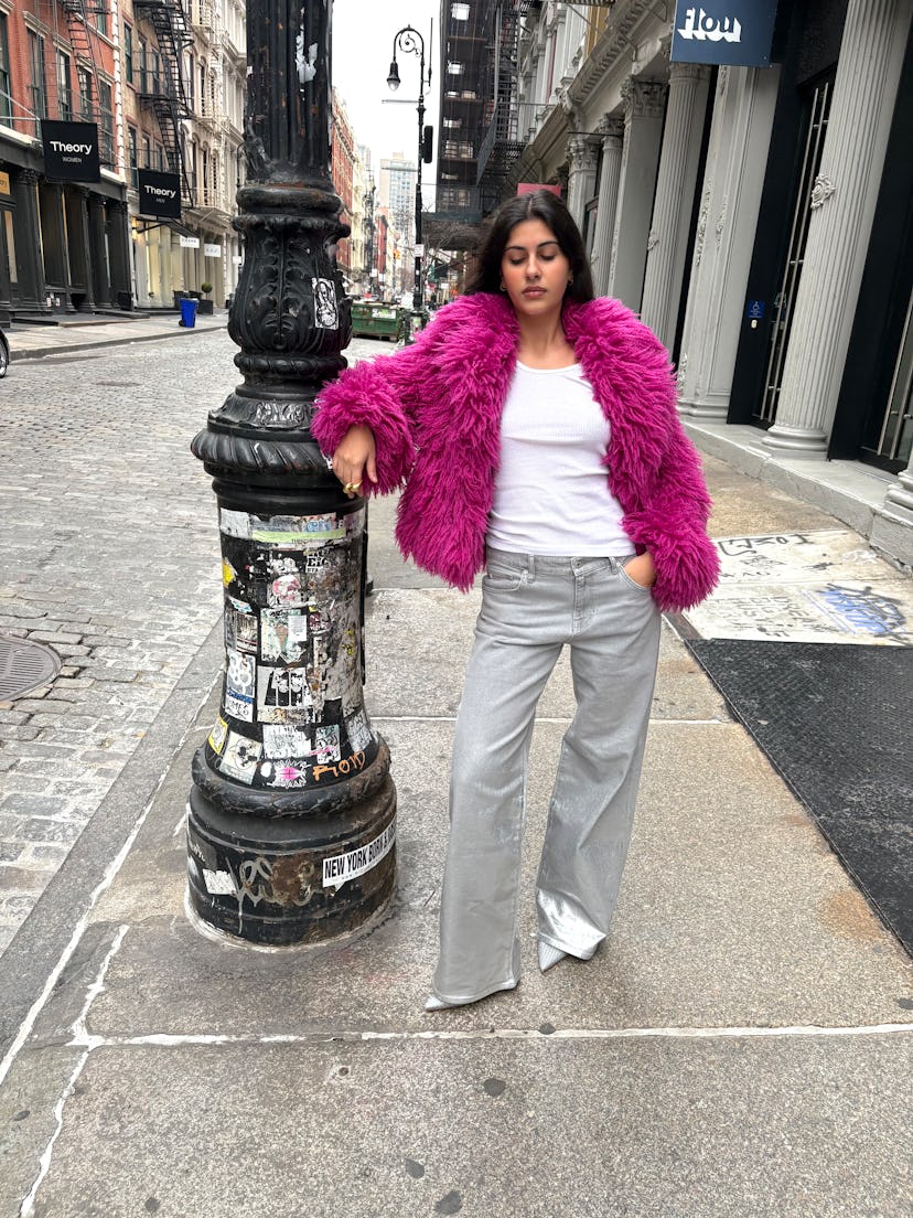 “For my pick, I opted for the Adria jeans. The cool gray denim fades into a silver metallic finish that adds just the right amount of sparkle, making them perfect for a comfy holiday look. I sized up for a relaxed, baggy silhouette that gives an effortlessly cool vibe, pairing it with a statement jacket and pointed heels. The dipped-in-silver effect gives these bottoms an instantly elevated feel, making them easy to dress up or down. As a devoted jeans girlie, these are sure to become a staple for city dinners and every festive plan on my calendar.”