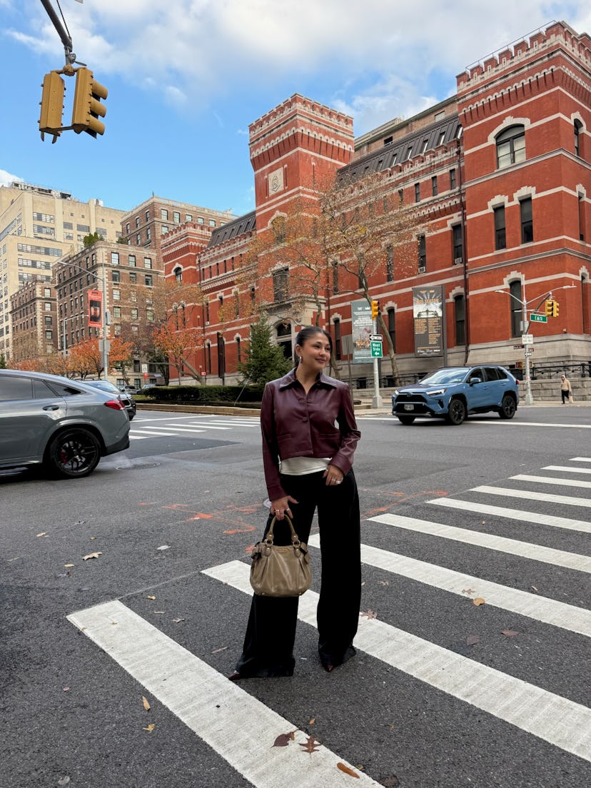 “A statement trouser is something I never knew I needed until I tried the Dorine jeans from AG. The subtle sheen gives them an almost glowy effect when the sun hits, making them such a fun piece to add to your wardrobe — plus, since they’re black, they’ll elevate almost any look. I paired mine with a bordeaux cropped faux leather jacket, a satin tank, pointed-toe heels, and my vintage Miu Miu bag. I don’t think I’ve ever felt more chic.