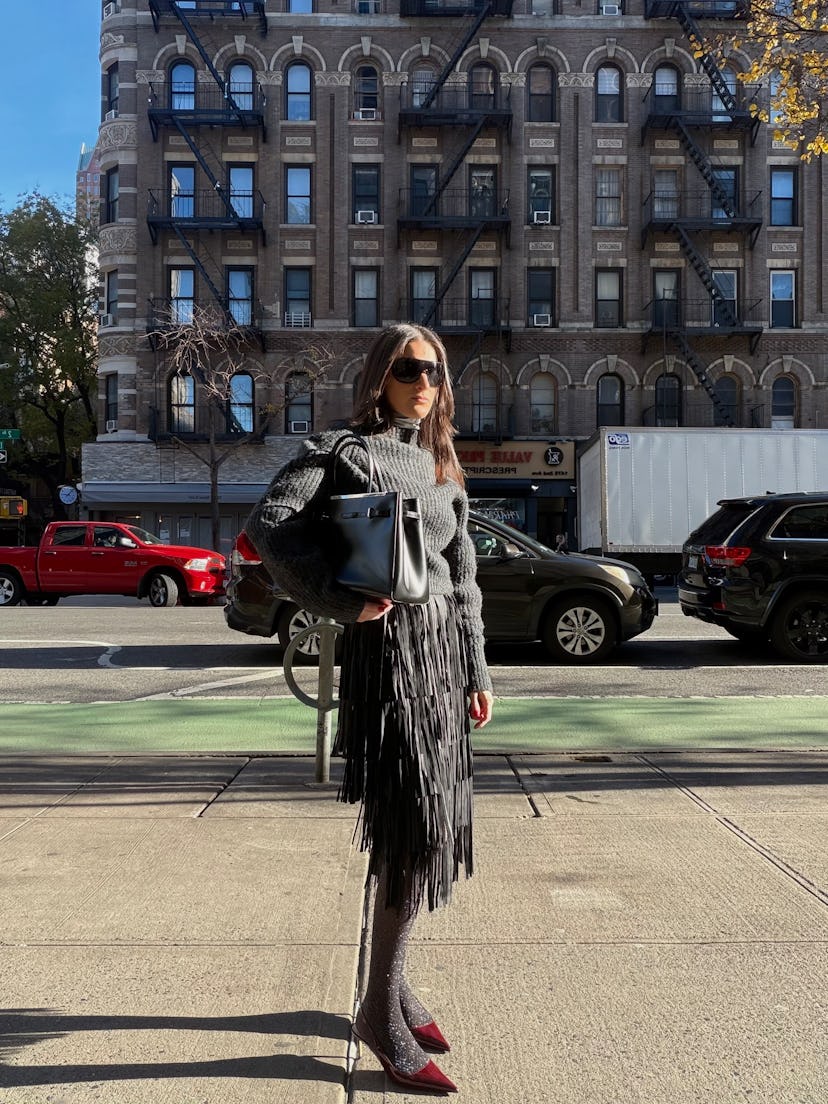 “I wear a lot of black and gray, so to shake things up, I’m constantly thinking about incorporating different textures into my wardrobe — which is, of course, easier during colder months. It’s safe to say that I was instantly drawn to this leather skirt and the way the fringes swayed in the wind. My first instinct was to anchor it with a chunky knit.