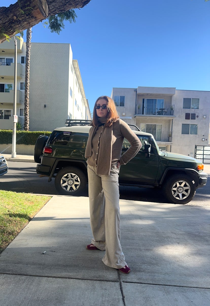 “This is my first winter living in Los Angeles, so I’m admittedly still figuring out how to dress in the balmy December weather. Fortunately, with temps in the low to mid-60s, I’ve been able to step out in some of my heavier wardrobe pieces, such as these AG Stella cinched pants crafted from soft wool flannel. To crank up the cozy, I opted for a cardigan and matching scarf, layered over a short-sleeve tee. Larroudé’s multi-color suede sneakers added a subtle splash of color to the neutral look. My consensus? I’m putting my denim on the back burner this winter in favor of these cozy bottoms.”