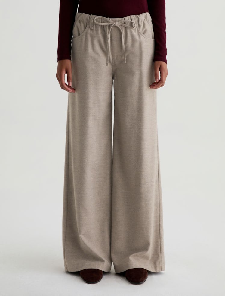 “This is my first winter living in Los Angeles, so I’m admittedly still figuring out how to dress in the balmy December weather. Fortunately, with temps in the low to mid-60s, I’ve been able to step out in some of my heavier wardrobe pieces, such as these AG Stella cinched pants crafted from soft wool flannel. To crank up the cozy, I opted for a cardigan and matching scarf, layered over a short-sleeve tee. Larroudé’s multi-color suede sneakers added a subtle splash of color to the neutral look. My consensus? I’m putting my denim on the back burner this winter in favor of these cozy bottoms.”