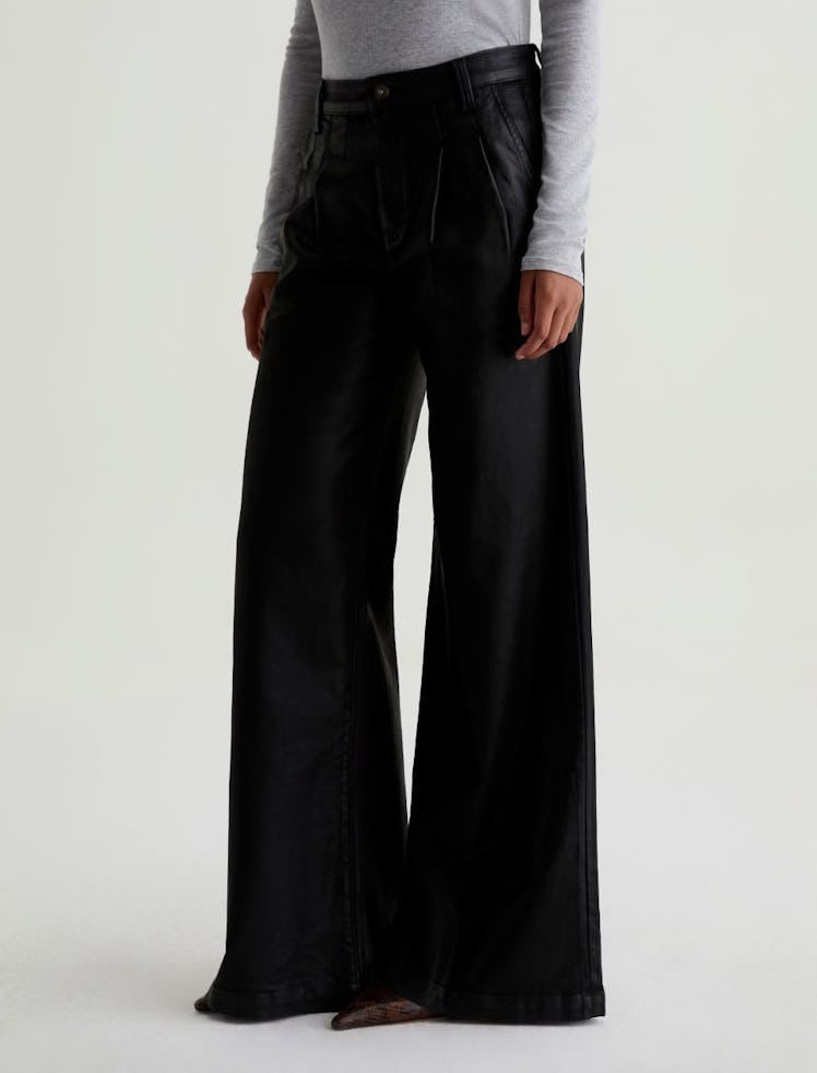 “A statement trouser is something I never knew I needed until I tried the Dorine jeans from AG. The subtle sheen gives them an almost glowy effect when the sun hits, making them such a fun piece to add to your wardrobe — plus, since they’re black, they’ll elevate almost any look. I paired mine with a bordeaux cropped faux leather jacket, a satin tank, pointed-toe heels, and my vintage Miu Miu bag. I don’t think I’ve ever felt more chic.