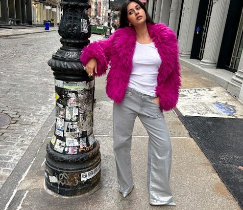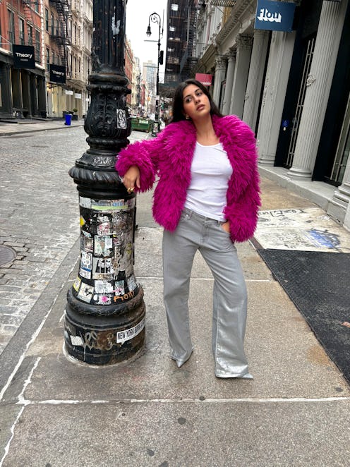“For my pick, I opted for the Adria jeans. The cool gray denim fades into a silver metallic finish that adds just the right amount of sparkle, making them perfect for a comfy holiday look. I sized up for a relaxed, baggy silhouette that gives an effortlessly cool vibe, pairing it with a statement jacket and pointed heels. The dipped-in-silver effect gives these bottoms an instantly elevated feel, making them easy to dress up or down. As a devoted jeans girlie, these are sure to become a staple for city dinners and every festive plan on my calendar.”