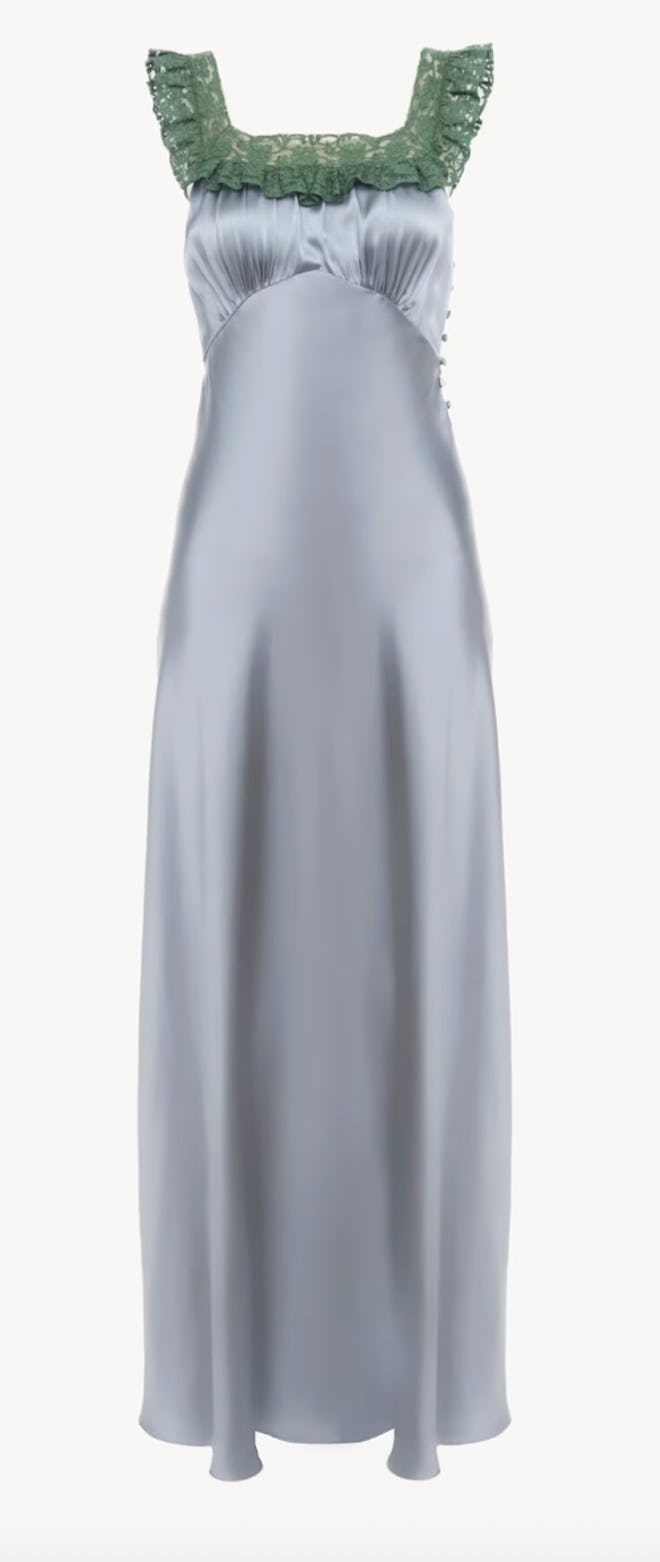 If you’re ready to invest in a forever piece, this Chloé design is worth the splurge. The blue silk satin feels timeless, while the green lace detailing adds an unexpected contrast that sets it apart. Finish the look with layered necklaces and an arm cuff for a touch of extra decadence.