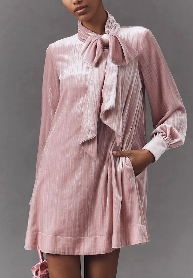 Velvet, pink, bows, and yes, pockets. This dress is giving Cindy Lou Who and leans fully into festive charm, with a playful silhouette that feels delightfully nostalgic. Style it with boots and leg warmers for a cozy night out.