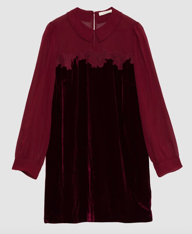 If the deep red trend is calling but a shorter hem feels more your speed, this dress delivers. The doll-inspired silhouette, finished with a sweet collar and delicate lace layered over plush velvet, strikes the perfect balance between playful and polished.